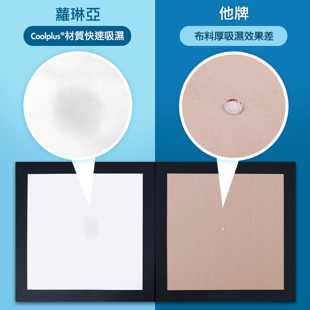 蘿琳亞特製「無感纖型布料」,使用Coolplus®智慧纖維材質,輕薄透柔、快速吸濕排汗,像是第二層肌膚柔軟貼合身體。