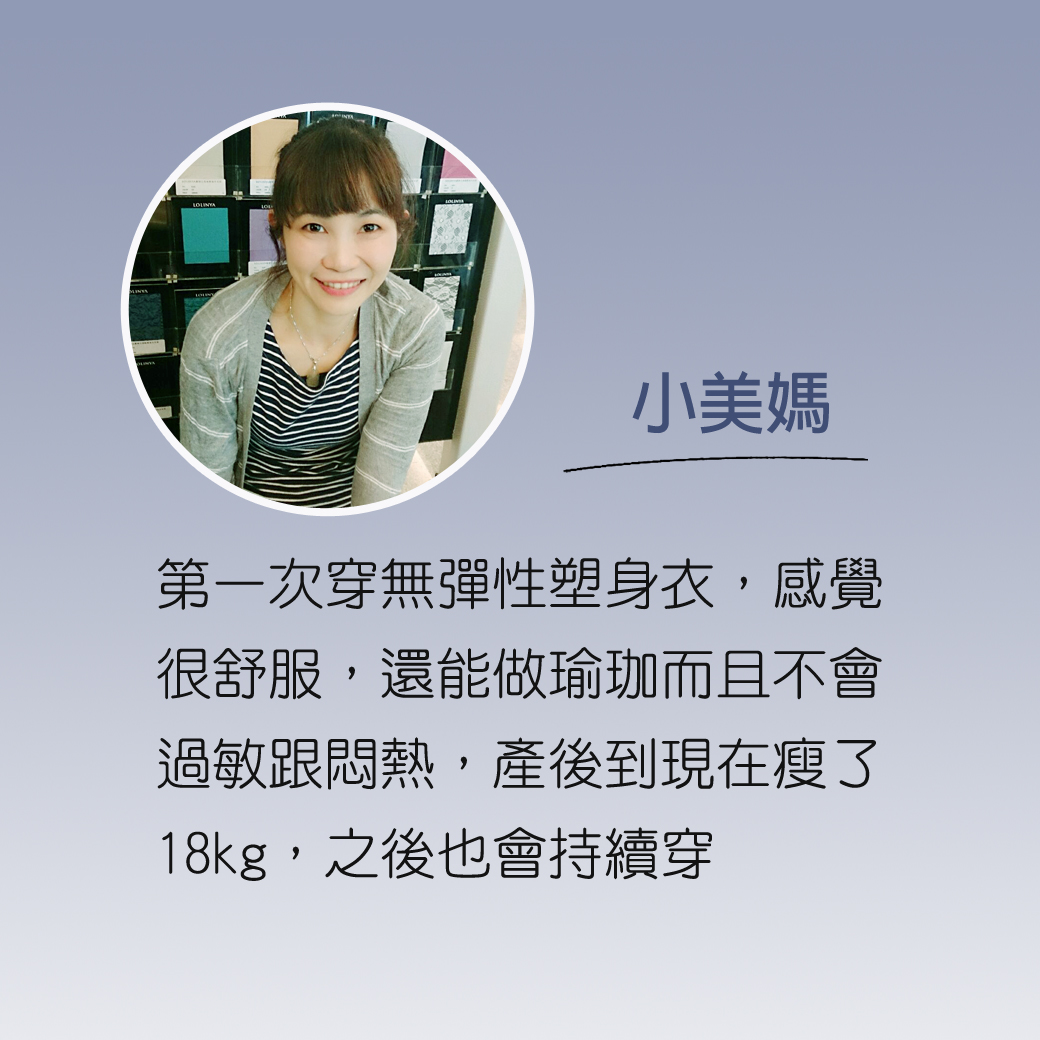 「無彈性纖型布料」不起皺,有效緊貼肌膚,且不會變形,並可依據人體不同動作,對體內脂肪施加適當壓力。